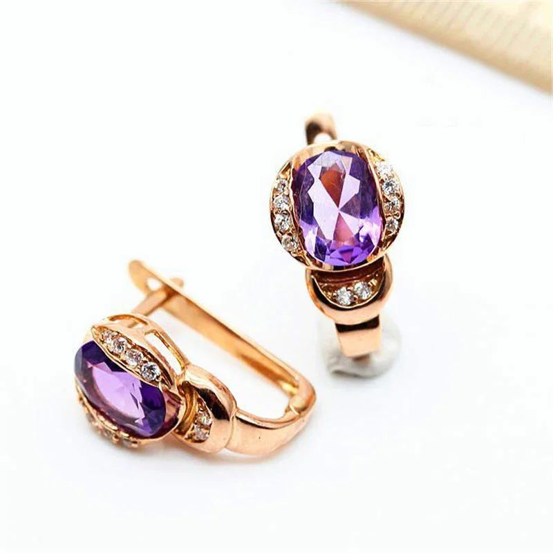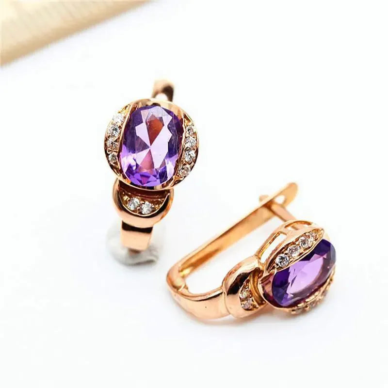 Ontdek de tijdloze elegantie van de ovale oorbellen in goudkleurig metaal, subtiel versierd met paarse stenen en delicate transparante stenen. Wanneer u ze draagt, wordt u omhuld door een gevoel van verfijning en sophisticatie, waarbij elk stuk het licht met gratie opvangt om uw gezicht te verlichten.