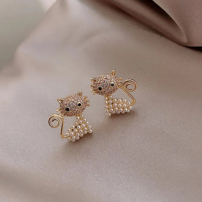 De kattenkop, versierd met kleine fonkelende steentjes, vangt het licht op een verbazingwekkende manier en trekt alle blikken zonder ooit opzichtig te zijn. De gouden spiraalvormige staart voegt een gracieuze kromming toe en benadrukt het verfijnde ontwerp.