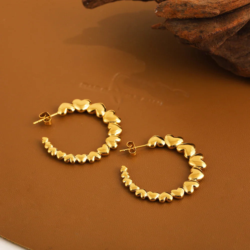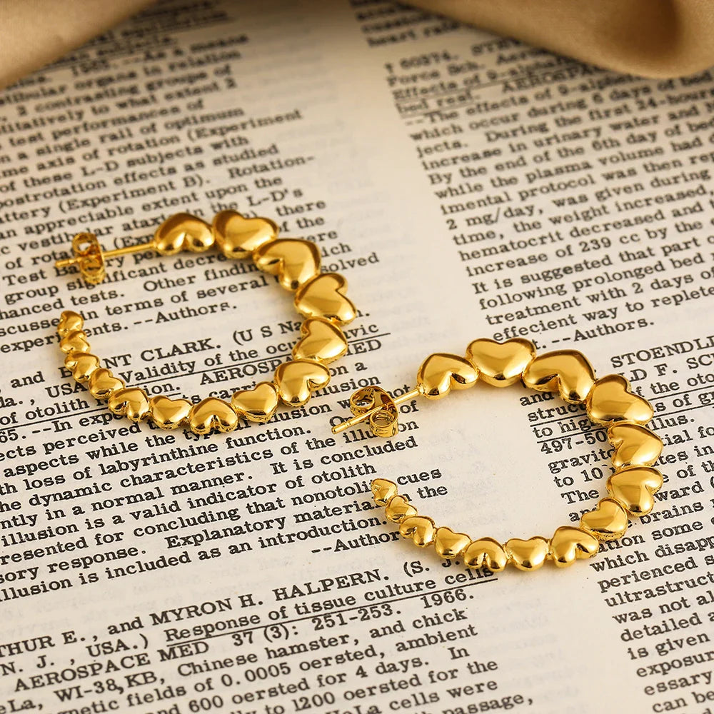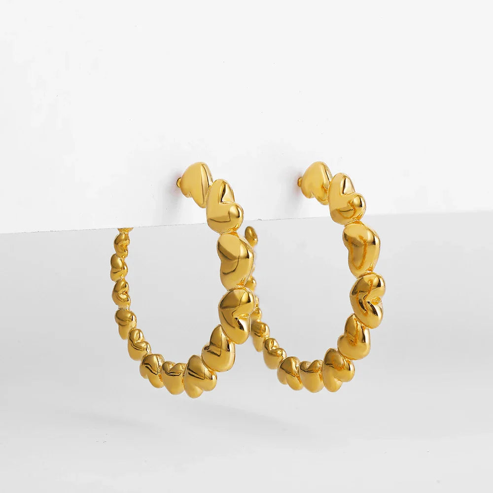 Ontdek de tijdloze elegantie van hartvormige creolen, met een gouden afwerking die het licht op een subtiele manier vangt. Deze oorbellen, van medium tot groot formaat, voegen een moderne touch toe aan je stijl en roepen tegelijkertijd een liefdevolle romantiek op.
