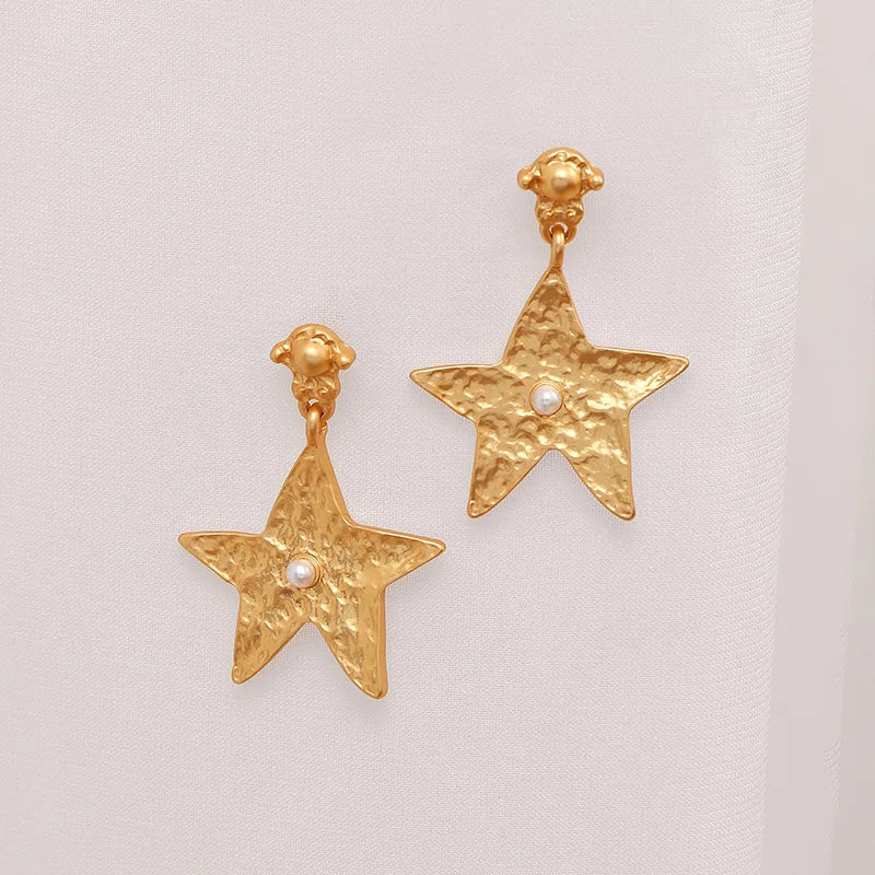 Ontdek de belichaming van delicate schoonheid met deze prachtige oorbellen in de vorm van een ster, verfraaid met een kleine parel in het midden, die het licht met elegantie vangen. Hun gehamerde afwerking, subtiel getextureerd, voegt een vleugje originaliteit en sophisticatie toe, waardoor u zich in elke gelegenheid kunt onderscheiden.