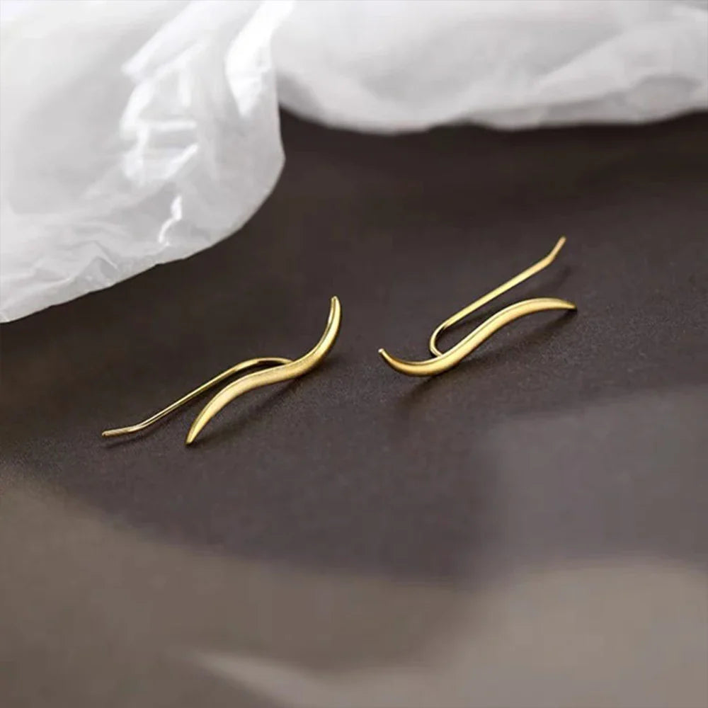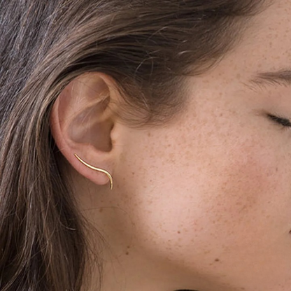 De Eenvoudige Klimmende Oorbellen rusten op de oorlel als een subtiele verklaring van verfijning en discrete elegantie.