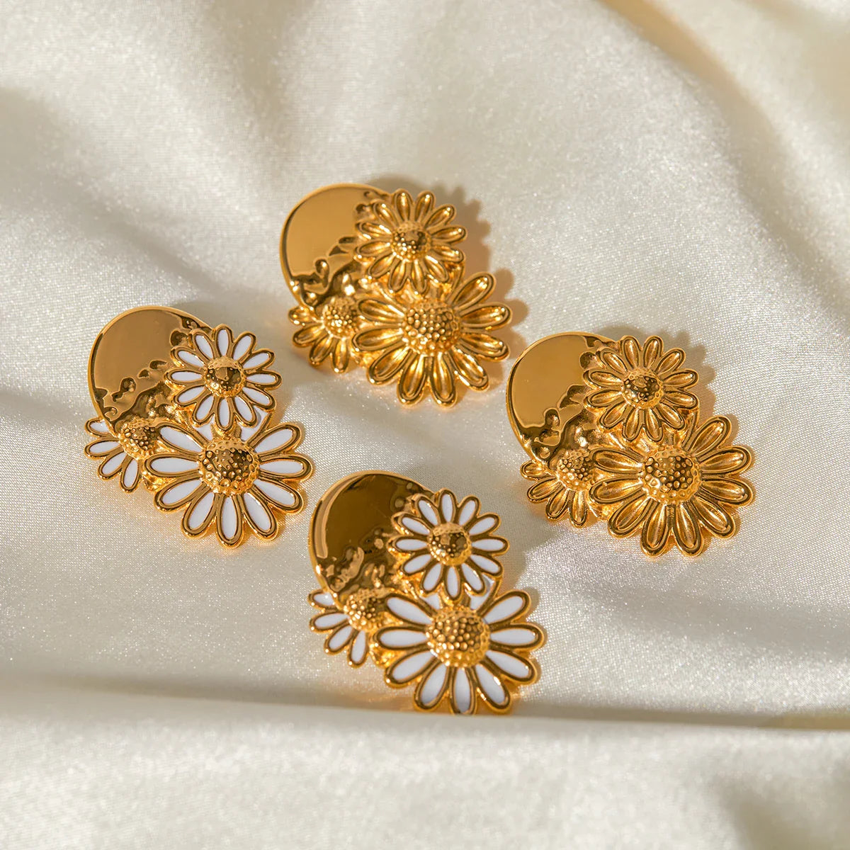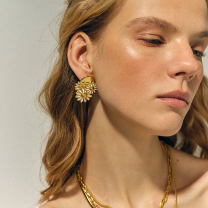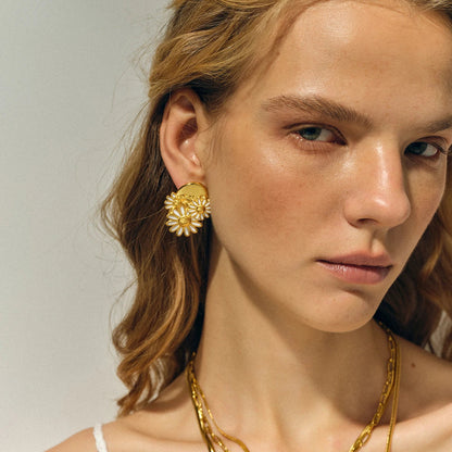 Verlicht uw teint en laat uw ogen stralen door de pure magie van deze sieraden! Met finesse en passie vervaardigd, vertegenwoordigen deze oorbellen margrieten die harmonieus zijn gerangschikt om een gevoel van frisheid en lichtheid aan uw uitstraling te geven.