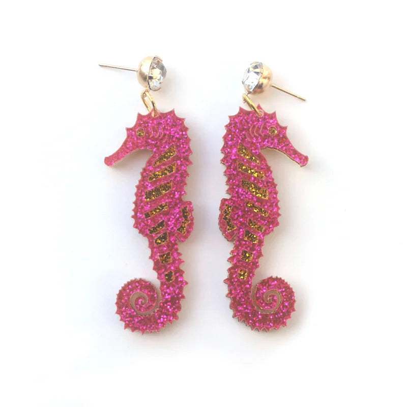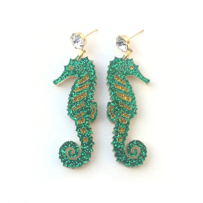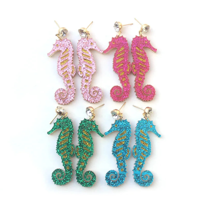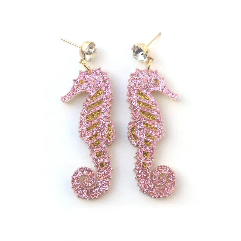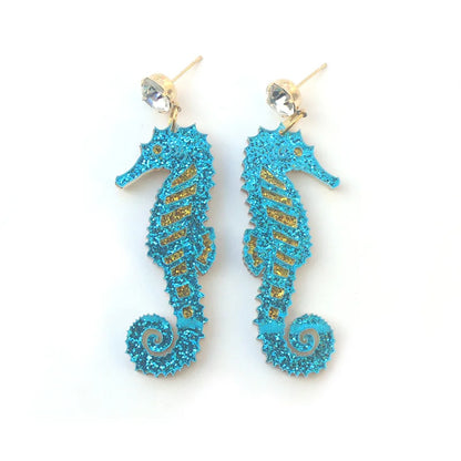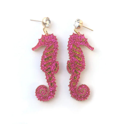 Deze schitterende oorbellen tonen een prachtig geglitterd zeepaardje, een echt symbool van vrijheid en magische zeewereld.