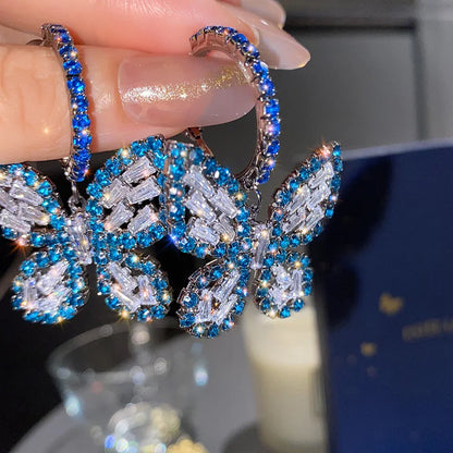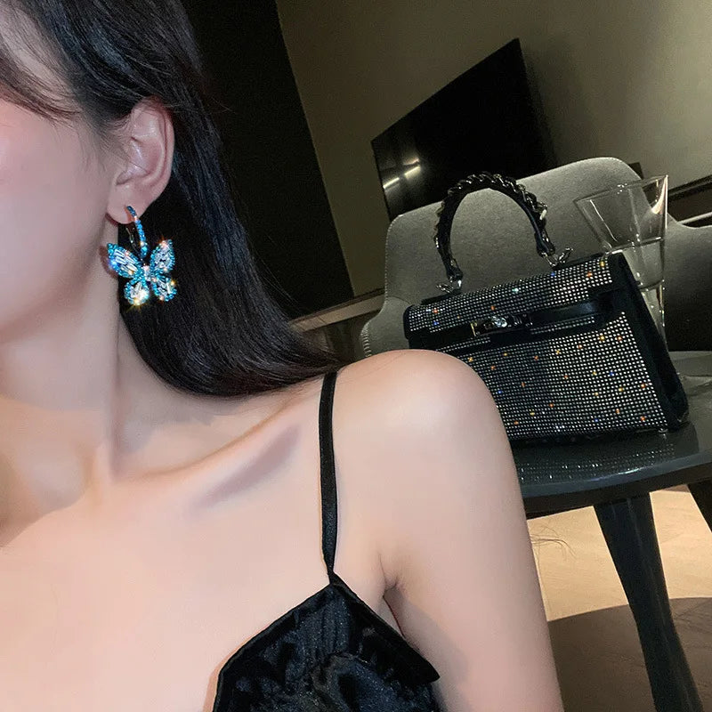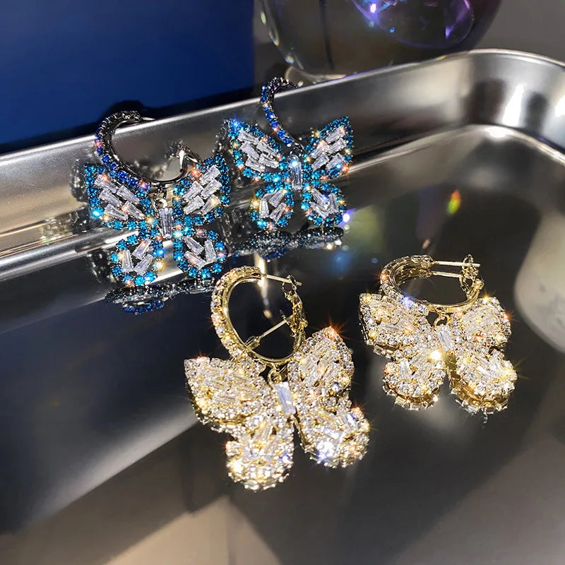 Ontdek de tijdloze elegantie van de vlinder oorbel, genaamd « Oorbellen Stralende Vlinder ». Dit unieke stuk, versierd met fonkelende strass, voegt een vleugje schittering toe aan al je outfits.