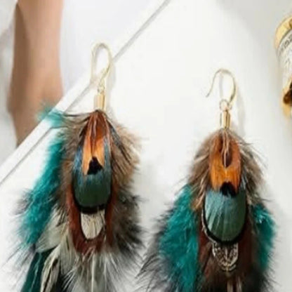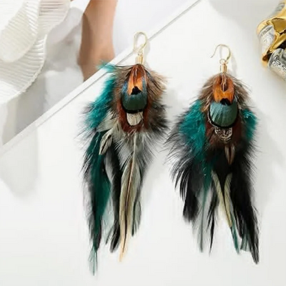 Ontdek de subtiliteit en elegantie van een hangende oorbel met veren, als een zachte adem van de natuur die uw dagelijks leven verrijkt. Met haar tinten van groen, bruin, zwart en wit nodigt dit unieke sieraad uit tot ontsnapping, en roept het betoverende landschappen en momenten van sereniteit op.