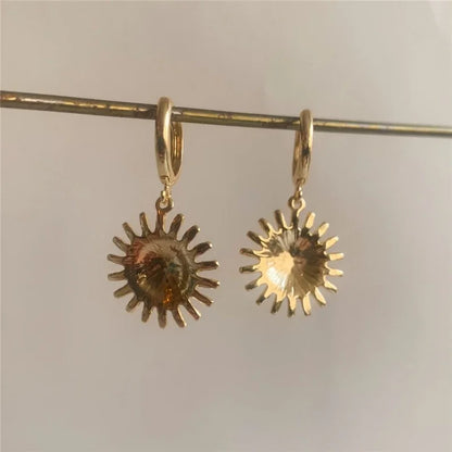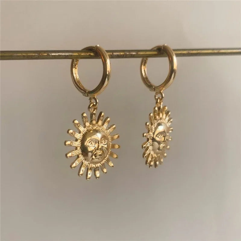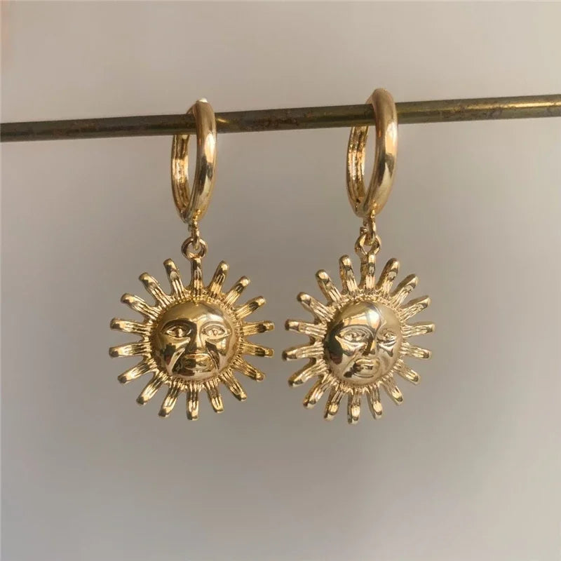 Laat u betoveren door de fijnheid van de oorbellen in de vorm van een zon, versierd met een delicaat gebeeldhouwd gezicht. Deze goudkleurige hangers, zowel elegant als modern, zullen uw gezicht verlichten met een vleugje warmte en positiviteit.