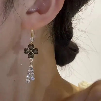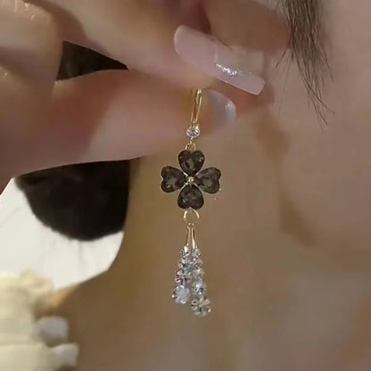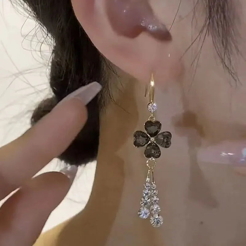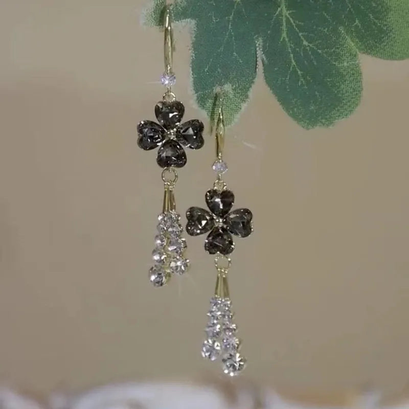 Ontdek de delicatesse van de Zwarte Klaver Oorbellen, een ware ode aan elegantie en verfijning. Met hun verfijnde vierbladige bloemvorm stralen deze oorbellen een tijdloze charme uit, terwijl de hangende trosvorm een gedurfde touch toevoegt.